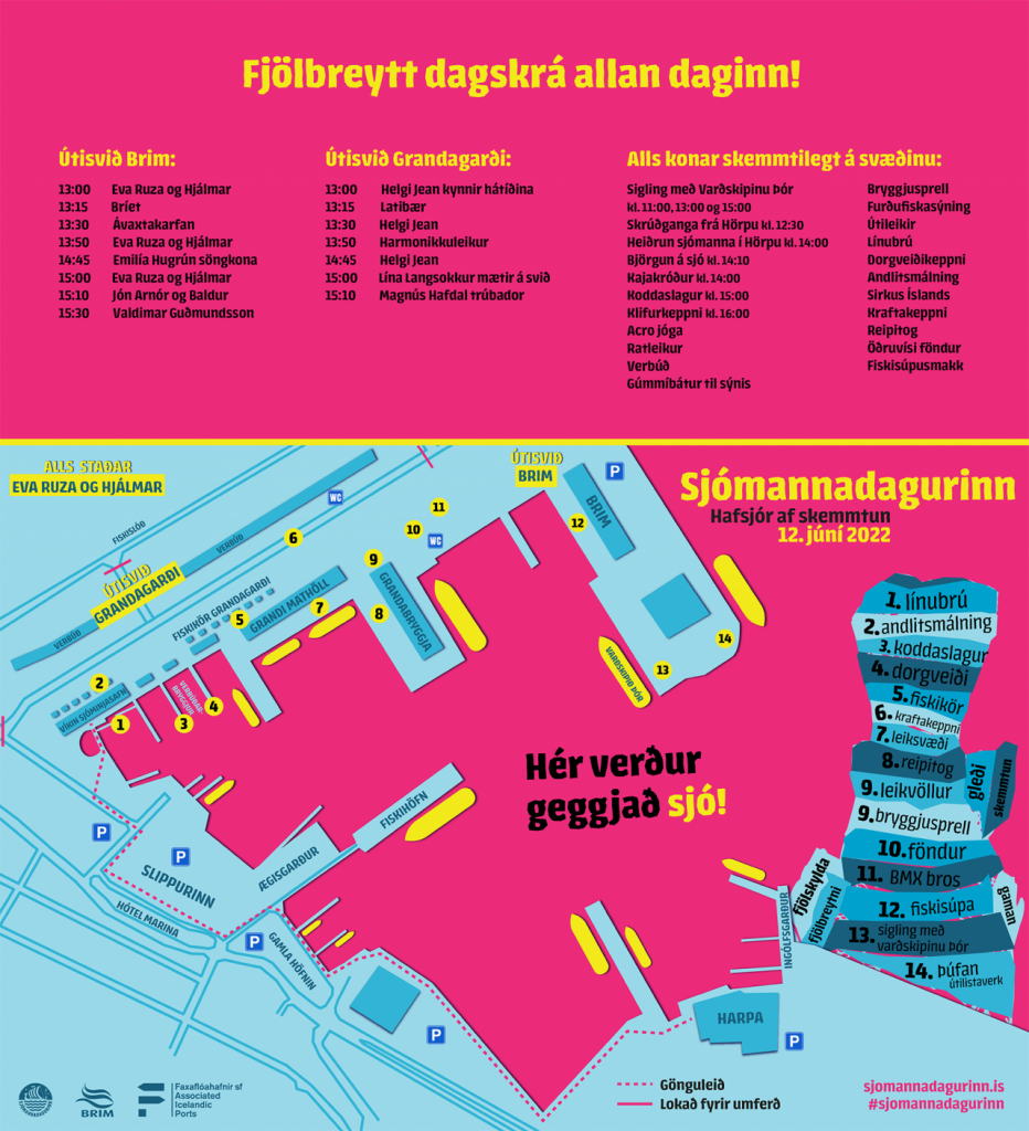 Það verður margt um að vera í kringum Reykjavíkurhöfn á Sjómannadaginn. Tvö útisvið verða sett upp. Annað sviðið er við Brim og hitt á Grandagarði. Þar stíga tónlistarmenn og leikarar á stokk milli kl. 13.00 – 16.00 og ættu flestir að finna eitthvað við sitt hæfi.