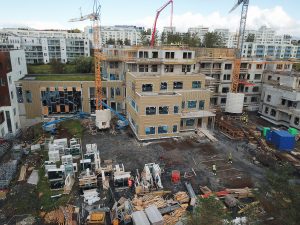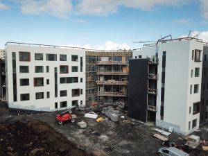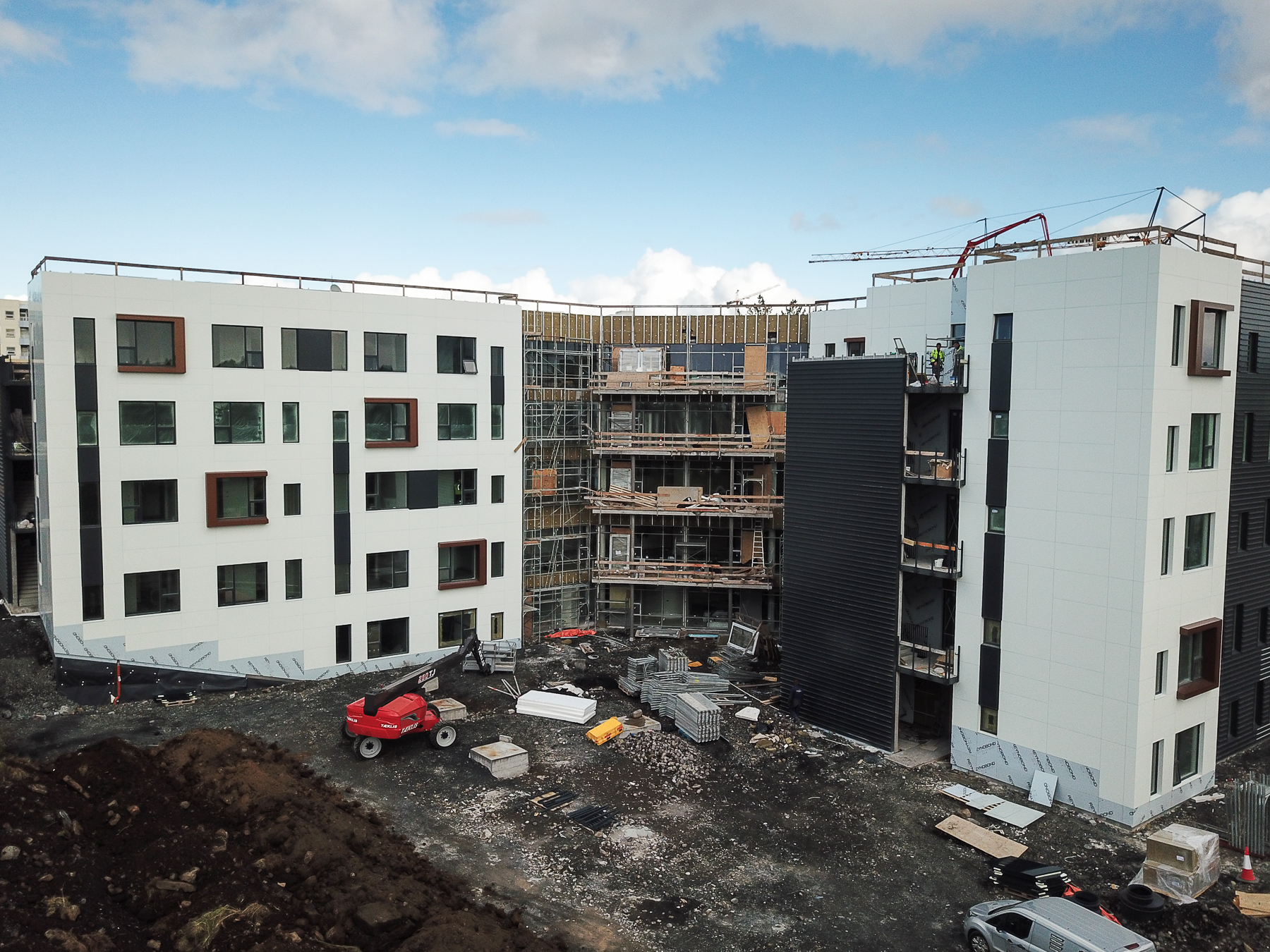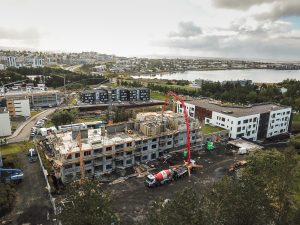 Verið er að steypa efstu hæðina á íbúðablokkinni og lýkur uppsteypu í næstu viku.