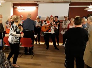 Það var mikið fjör á haustfagnaði Naustavarar sem haldinn var fyrir íbúa á Hraunvangi 1 og 3 í Hafnarfirði í gær. Hjördís Geirs og Hafmeyjurnar héldu uppi fjörinu og skemmtu viðstöddum. Skemmtunin var haldin í Súðinni sem er á Hrafnistu og var vel mætt.