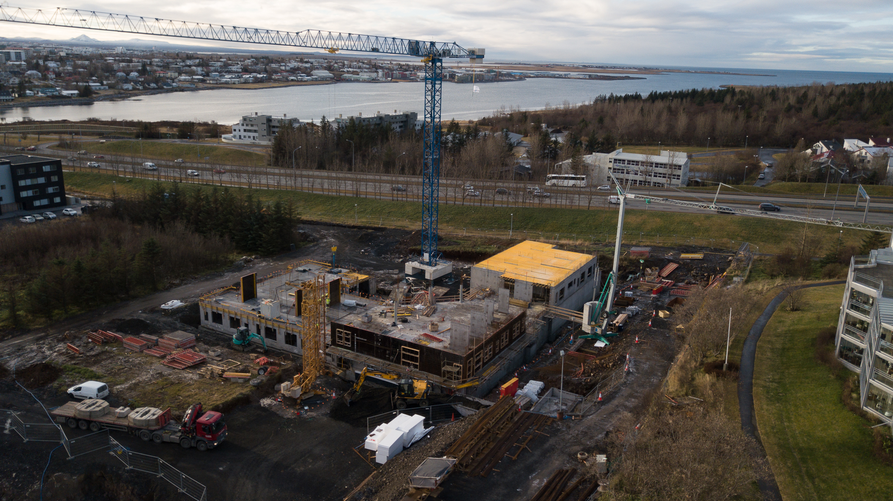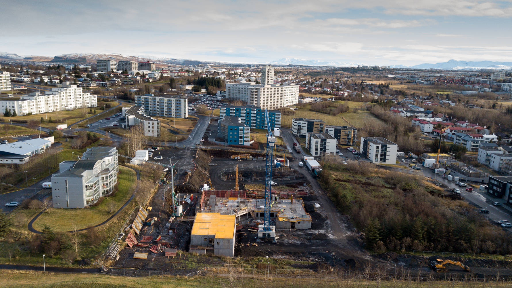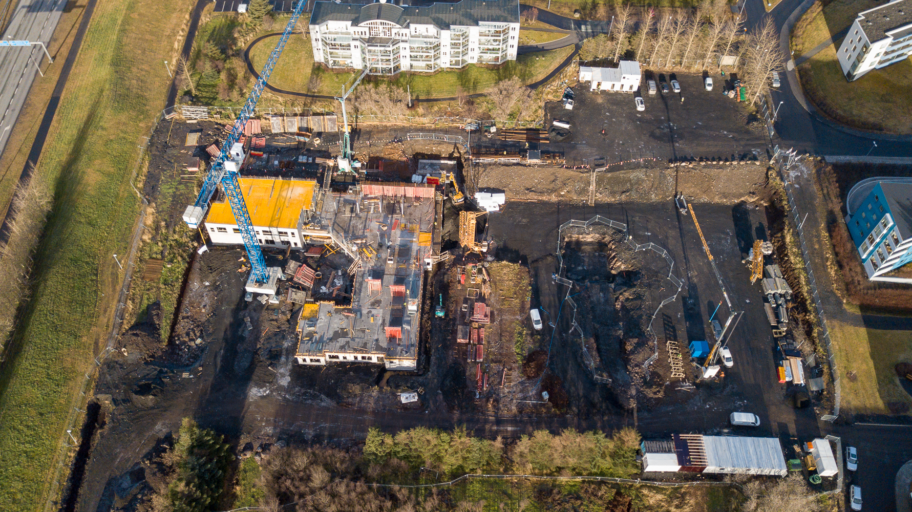 Í byrjun hvers mánaðar sendum við dróna til að skoða framvinduna í byggingunni við Sléttuveg. Hér er myndbandið sem var tekið 2. nóvember. Eins og sjá má þá er búið að steypa alla fyrstu hæð og byrjað á þeirri næstu á hjúkrunarheimilinu. Einnig er verktakinn sem fer að reisa íbúðirnar byrjaður að setja upp aðstöðu og reisa krana.